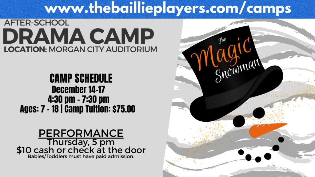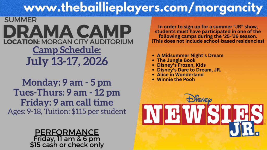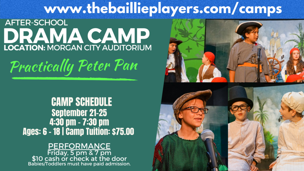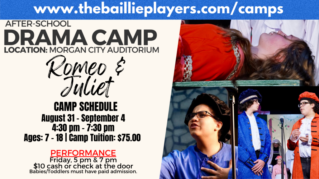 NOTE: All students who register for camp are automatically in the performance… ALL camps require an online audition AFTER registration is complete for speaking roles.